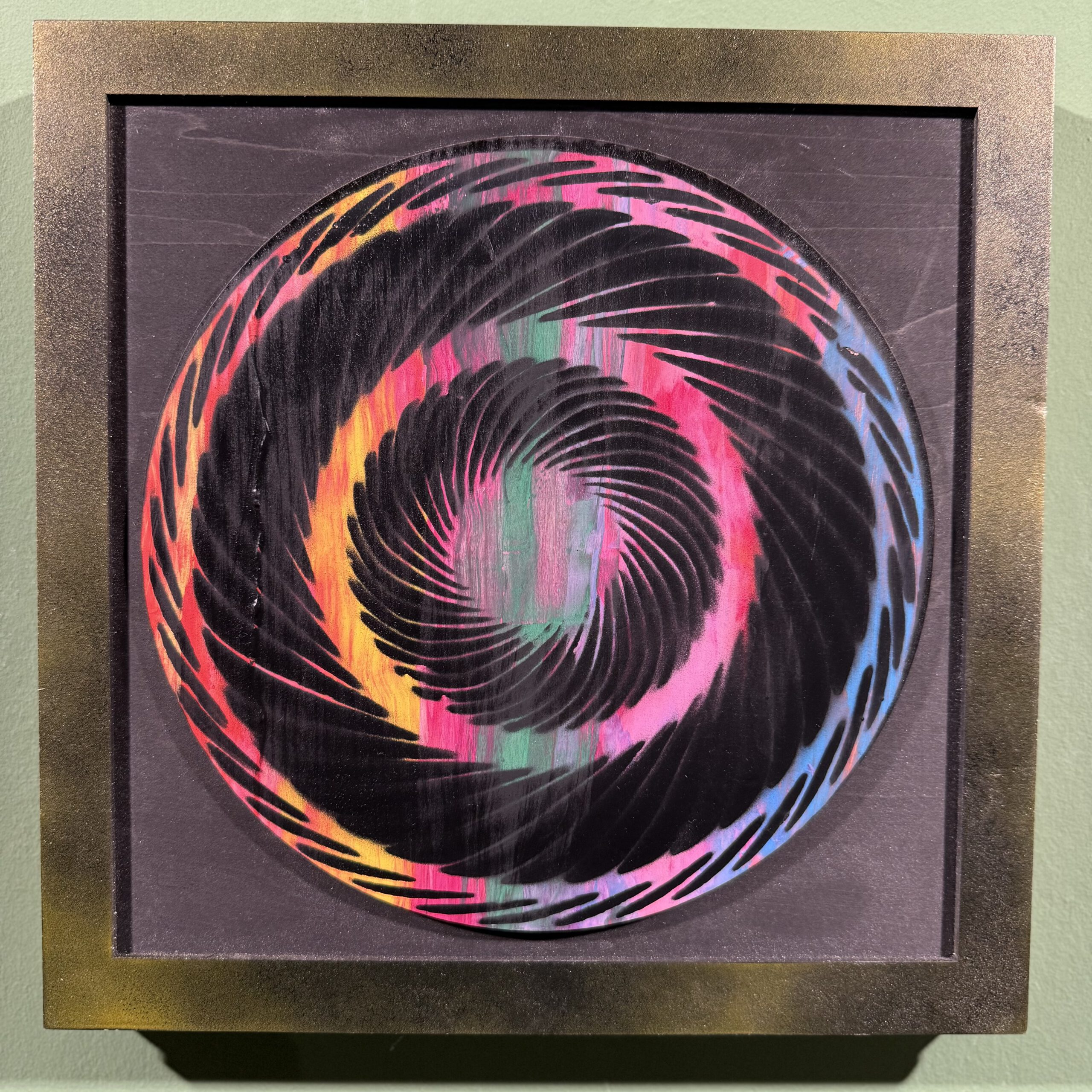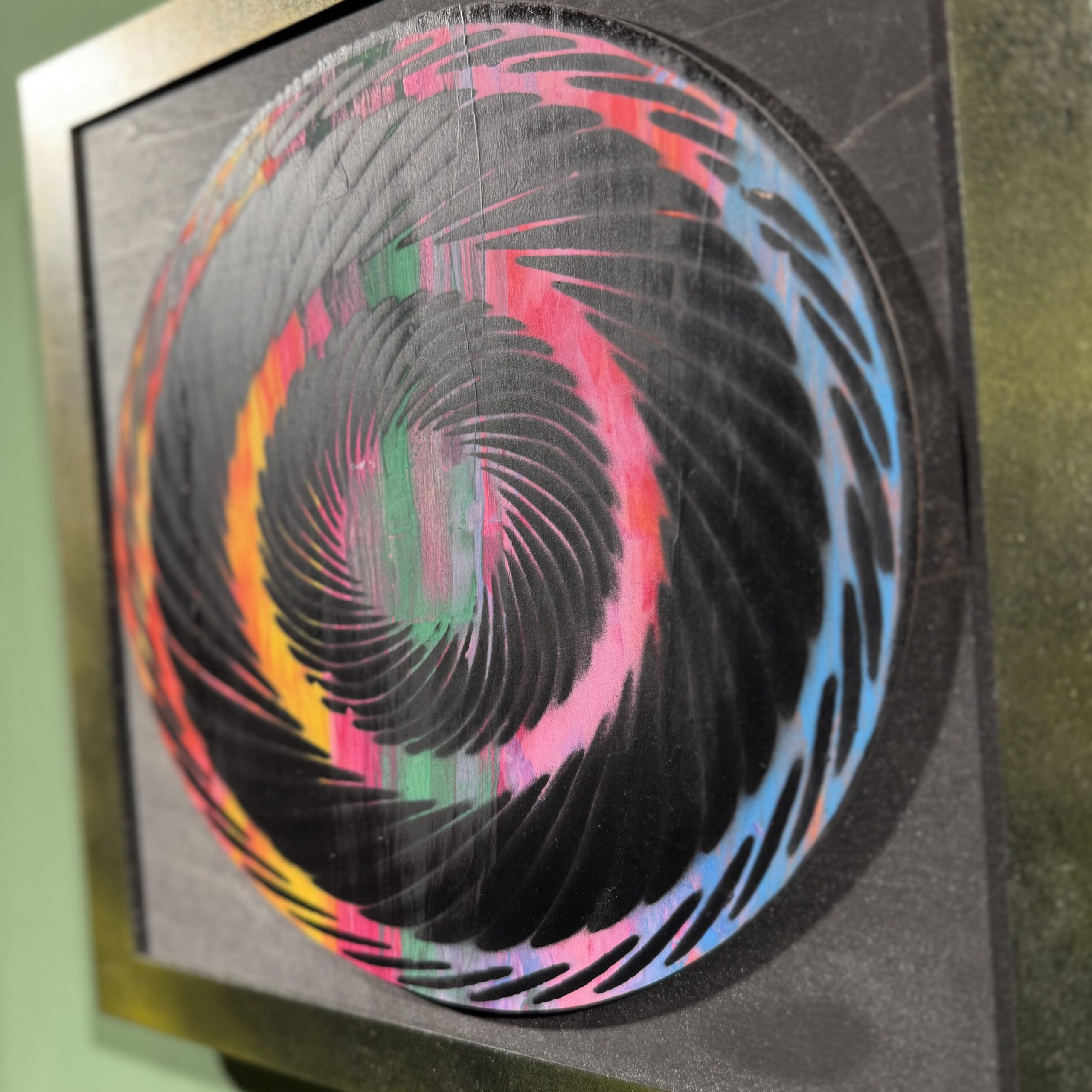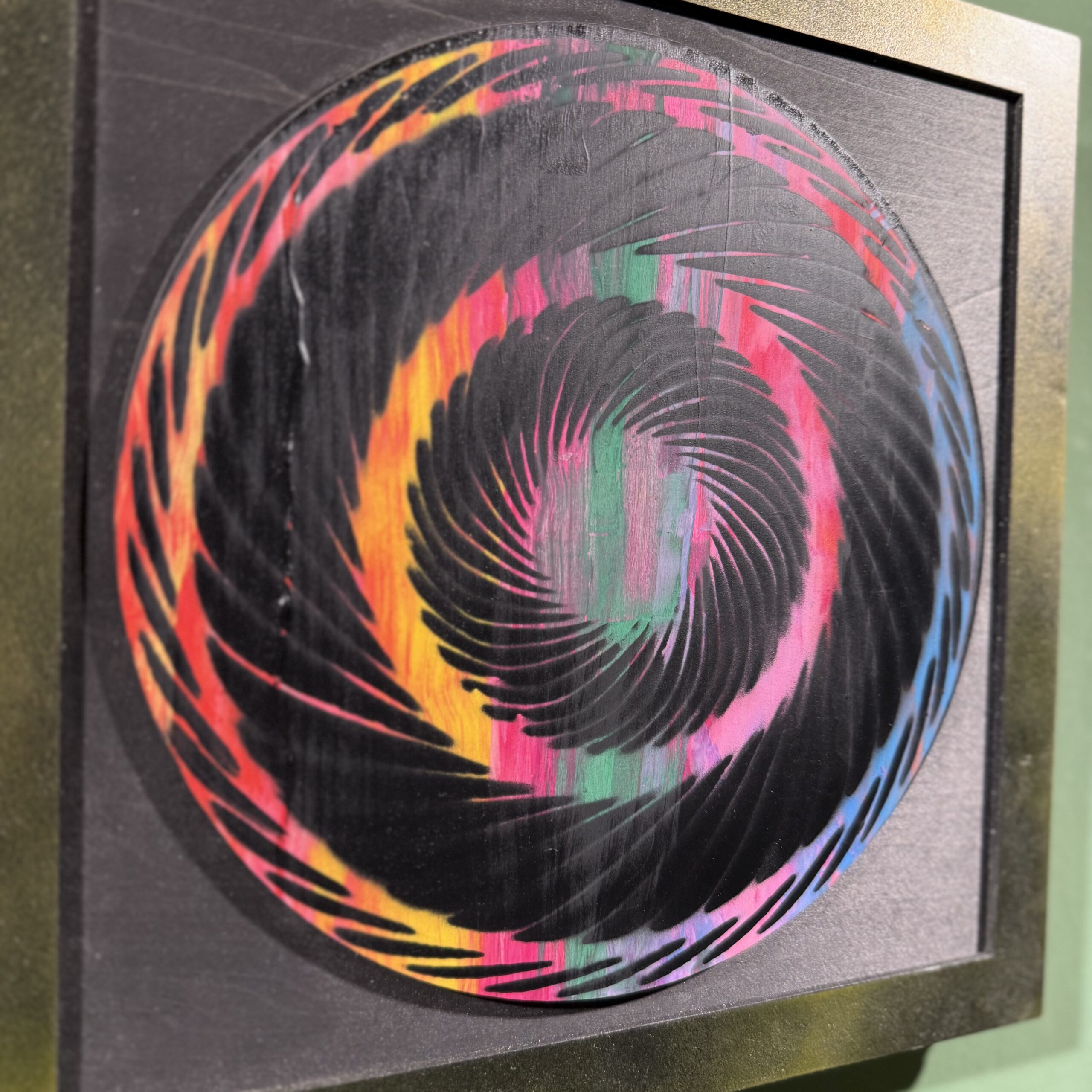 Rainbow Turbine entführt in ein hypnotisches Farbspiel: Auf einem 30 × 30 cm großen Holzrelief rotieren filigrane Turbinenschaufeln in sanfter Spirale. Das Zusammenspiel aus präziser Handarbeit und lebendigen Farbübergängen macht das Werk zu einem faszinierenden Blickfang.